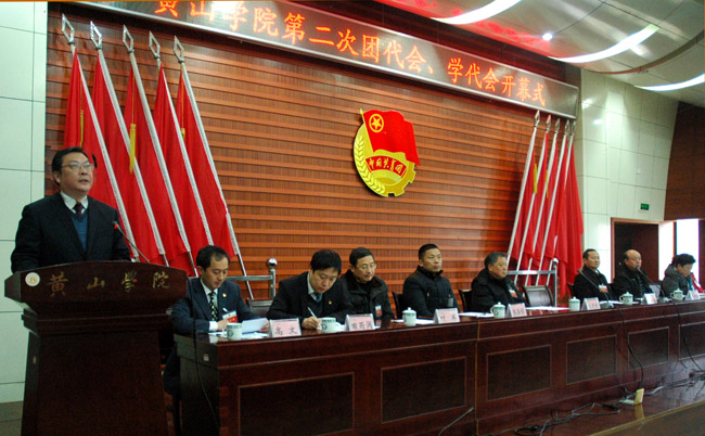 徐成钢发表热情洋溢的讲话。他首先代表学校党政领导班子向大会表示热烈祝贺,向出席大会的代表和来宾以及全校团员青年表示亲切的问候。徐成钢在讲话中充分肯定第一次团代会、学代会以来我校团学工作所取得的成绩与进步,要求全校高度重视青年工作。他殷切希望全校广大团员青年,要坚定理想信念,努力成为中国特色社会主义事业的可靠接班人;要坚持高尚品行,努力成为社会主义核心价值体系的模范践行者;要勤于学习实践,努力成为中华民族复兴大业的出色实干家。徐成钢强调,我校广大团员青年要认真汲取徽州文化营养,传承黄山精神,将迎客松的开放精神、徽骆驼的吃苦精神、徽州人的和合精神、古徽商的诚信精神融进自己的血脉。