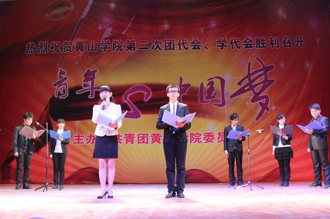1月10日晚,大会有关领导、全体代表以及全校学生欢聚一堂观看了“青年心•中国梦”——团、学代会的主题晚会,舞蹈《致祖国》、诗朗诵《青年心•中国梦》、大合唱《校歌》、《走向复兴》、二重唱《把一切献给党》等节目精彩纷呈。