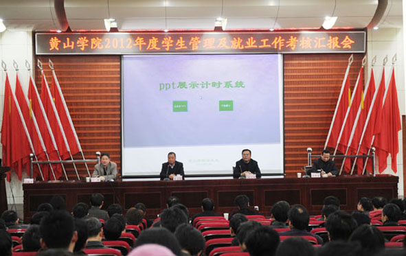 3月22日上午,黄山学院2012年度院部学生管理及就业工作考核汇报会在逸夫图书馆二楼报告厅进行。党委书记徐成钢、院长汪建利、纪委书记吴邦贵、党委副书记叶军出席汇报会。
