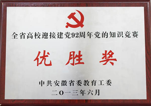 6月1日,安徽省高校迎接建党92周年党的知识竞赛在安徽大学举行。经激烈角逐,由我校化学化工学院郑秋、余琴、孙丽丽三位同学组成的黄山学院代表队获得优胜奖。