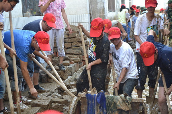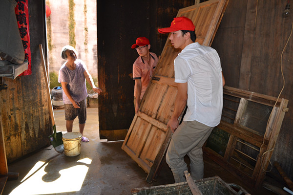上午8点突击队到达灾区。徽州区区委常委、组织部长熊志伟到场指挥,强调做好环境整治,卫生防疫。徽州区团委书记甘红圣对成员进行了分组分工。眼前一片狼藉,到处是洪水淹没的痕迹,倒塌的房屋和堆积的淤泥使得前行的道路异常艰难,志愿者们索性卷起裤腿,任凭淤泥淹没鞋面,行走在其中,大家拿起手中的铁锹和锄头将淤泥堆积在墙壁一侧,分区域清理出一条条道路,并沿途不断地疏通排水沟,排出洪水。一些志愿者看到受灾家庭中只有年迈的老人时便主动上去帮忙搬运杂物,铲除屋内淤泥,老人们用当地方言表达感谢之情。