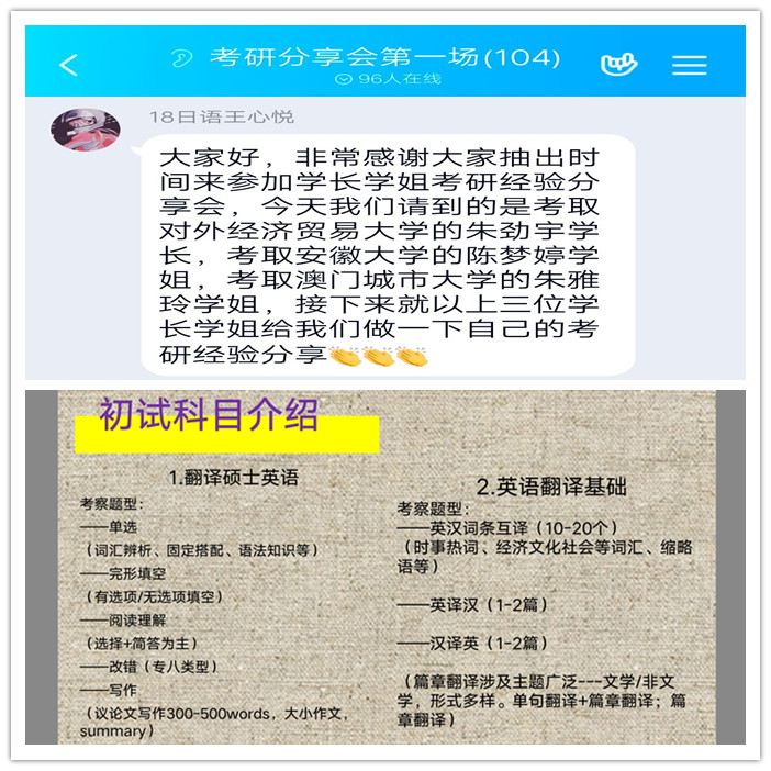 6月16日晚上7点,外国语学院通过QQ群开展本学期首场考研交流会。本次交流会邀请朱劲宇、陈梦婷、朱雅玲三位16级学生进行考研心得分享,他们考取的学校分别为对外经济贸易大学、安徽大学以及澳门城市大学。该院学生共200余人参加交流会。