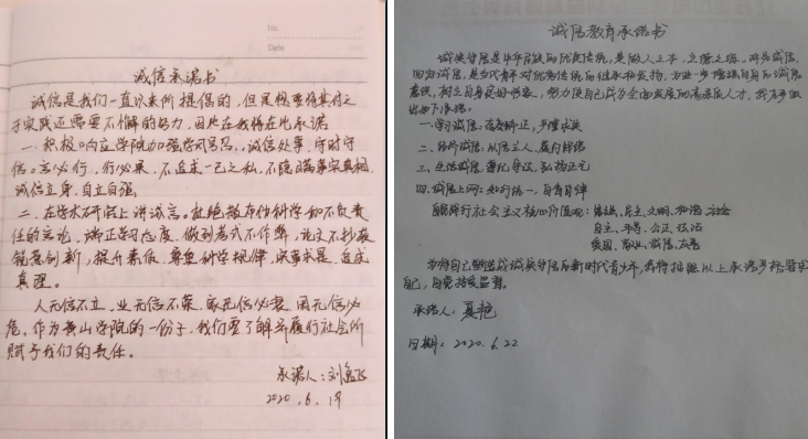 本次活动通过诚信应考线上宣传、主题征文、摘选佳句等形式展开。艺术学院各专业、班级纷纷响应,通过线上会议形式宣传学校有关考试的具体要求,摘选真实案例警醒和引导学生杜绝考试作弊。活动中,同学们根据自己对诚信的理解、感悟和启发,或签订诚信应考承诺书、或撰写诚信主题文章、或摘选诚信小故事,充分表达了自己坚决杜绝懒散慵懒,端正态度迎接考试的决心。