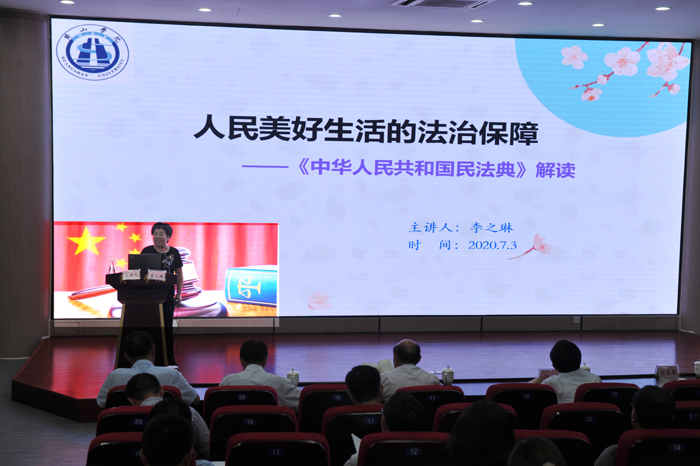 7月3日下午,校党委在文端楼二楼报告厅举办党委理论学习中心组(扩大)专题学习会,经济管理学院副教授李之琳应邀作题为《人民美好生活的法治保障——<中华人民共和国民法典>解读》的专题辅导报告。校党委书记汪枫,党委副书记胡家俊,副校长刘英旺、张德学,全体处级干部,机关全体科级干部参加报告会。报告会由党委委员、宣传部长张赛主持。