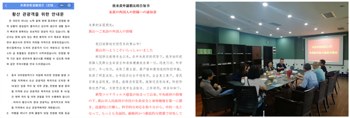 在疫情期间,该院积极服务学生就业,举办云招聘3场,提供岗位261个,对就业困难的学生实行就业帮扶;该院创先争优小组通过微信、QQ群定期发布疫情防控的相关爱心小贴士,号召大家关注疫情,提醒提示大家如何做好个人防护;举办“师生连线”活动,由党员教师点对点连线学生,为学生心理健康保驾护航。外国语学院还选派教师志愿者,参与黄山市疫情防控外语翻译志愿活动。教师们翻译、校对了《致来黄各国朋友的一封信》《新冠肺炎防疫明白纸》《来黄外籍人员联系卡》及《来黄旅游温馨提示》等政策、宣传材料共计6000余字,获得黄山市外事办及相关防疫单位的好评。期间,外国语学院将与黄山市外事办进一步合作,成立疫情防控外语志愿者服务队,充分调动师生力量,通过笔译、电话、语音、视频等方式,为各地疫情防控应急指挥部、交通转运专班、医院、隔离点及社区提供翻译服务,助力黄山市疫情防控外籍人员转接工作。