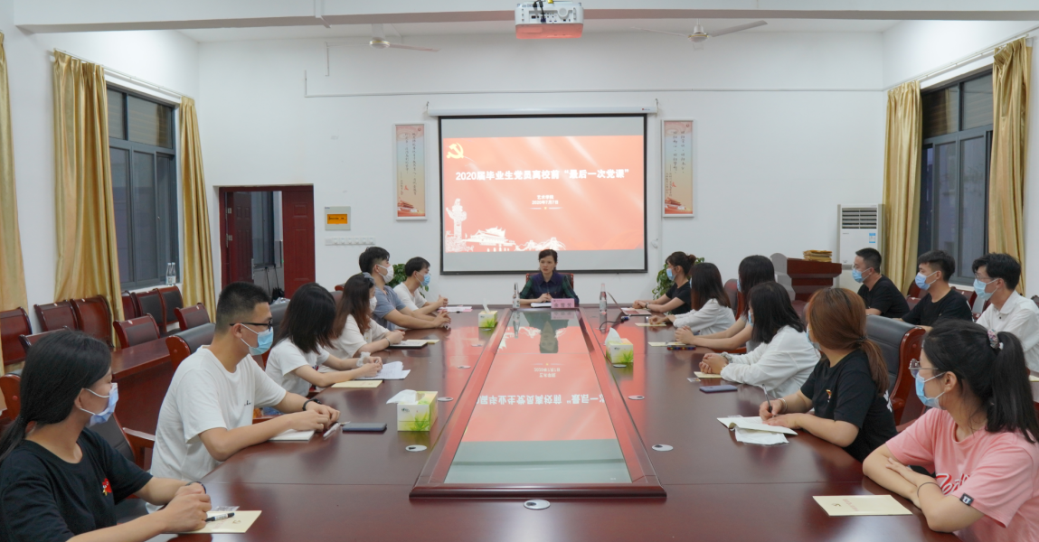 7月7日晚,艺术学院2020届毕业生党员离校前“最后一次党课”在文敏楼三楼会议室举行。该院党委书记余雪芳、学生党支部书记蒋家伟以及毕业生党员参加此次活动。