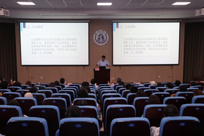 黄山日报资深摄影记者詹强华作关于新闻摄影知识的报告会,他围绕基础理论、构图与拍摄技巧、对焦方法,以及他多年积累的工作经验一一传授给学生。学生们被报告人扎实认真的创作作风所折服,体会到了新闻工作者的责任与担当。