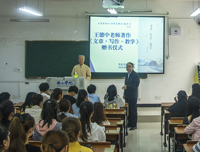 赠书仪式上,王德中与同学们讲述了从教经历,表达了赠书的目的意义。王德中分别从文章品性论、写作关键论、教学法门论等三个方面向学生们介绍了自己的著作并寄语同学们珍惜韶华,永葆芳华,始终以自律的人格、旺盛的精力、坚定的意志进行创造性劳动,毕生为国家、为人民奉献自己的心血。