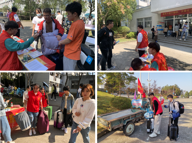 学院迎新志愿者热情周到地忙碌着,为新生做好引导、登记、咨询、寝室入住等工作。