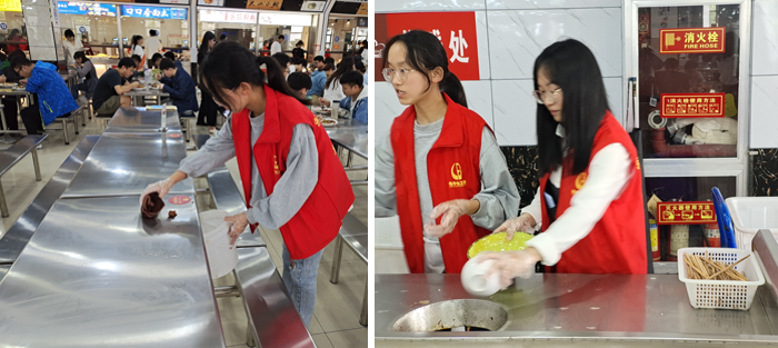 为贯彻落实习近平总书记关于制止餐饮浪费行为的重要指示精神,进一步弘扬中华民族勤俭节约的传统美德,9月我院组织开展了以“珍惜粮食,拒绝浪费”为主题的系列活动。活动中,志愿者们来到食堂,向来食堂就餐的老师、学生倡议养成“珍惜粮食,拒绝浪费”的良好习惯,拒绝餐桌浪费,从点滴做起。志愿者们在同学们用餐后,仔细的清理餐桌上的油渍和残余垃圾。遇到同学有过度浪费的行为,他们会立即进行劝阻。