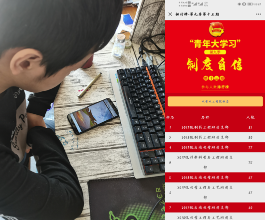 为引导广大团员学习党中央精神,加强共青团政治性和先进性建设,化学化工学院团总支按照校团委要求,依托“安徽共青团”公众号,深入开展丰富多彩、生动活泼的“青年大学习”主题教育活动,组织学生对“青年大学习”网上主题团课进行学习。