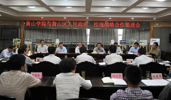 5月12日下午,我校与黄山区人民政府校地战略合作推进会在黄山区政府会议室举行。校长汪建利,副校长胡善风,黄山区区委副书记、区长方文辉,区委常委、常务副区长冯学祥,区委常委、副区长朱敏出席会议。学校办公室、教务处、生命与环境科学学院、旅游学院、经济与管理学院、教育科学学院、建筑工程学院、文化与传播学院负责人及黄山区相关单位负责人参加会议。冯学祥主持会议。